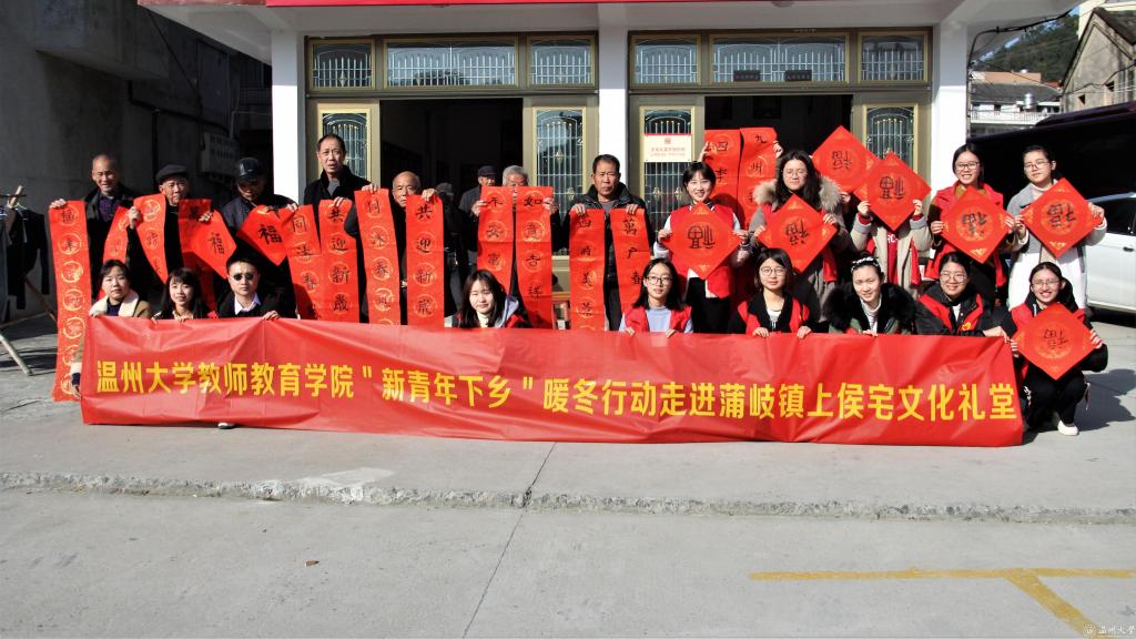 年关已近,新春将至,寒潮抵挡不了志愿者们下乡送温暖的热情。2018年1月10日14:00,温州大学教师澳门六合彩预测 “新青年下乡”暖冬行动走进上侯宅文化礼堂、下侯宅文化礼堂,拉开了迎新春的序幕。翰墨飘香迎新岁,喜气洋洋的春联蕴含着教院学子满满的心意;载歌载舞贺丰年,诙谐欢快的三句半、柔中带刚的太极都为蒲岐镇老人们带去了欢声笑语。