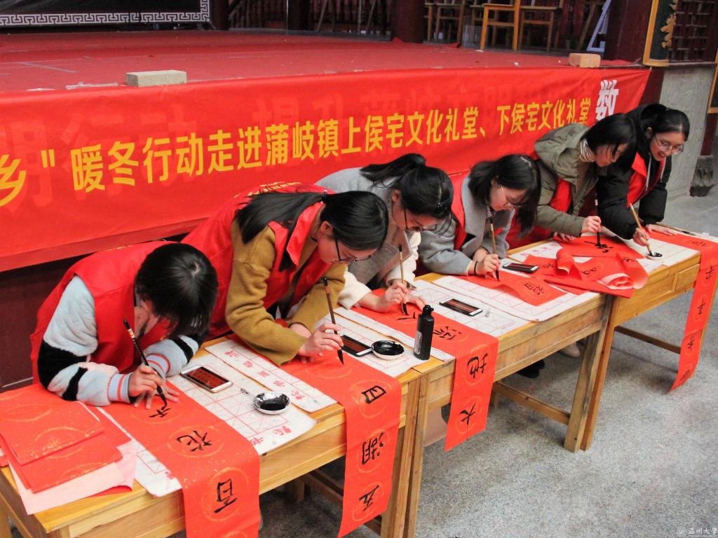 “千门万户瞳瞳日,总把新桃换旧符。”送春联是中华传统文化习俗,更是教院学子表达对老人殷切关怀的传递之举。20名青年志愿者不惧寒风凛冽,凝神挥毫,精神饱满,现场书写满载祝福与美好憧憬的春联,送予蒲岐镇的老人家们。“共迎新岁喜迎门”、“四季平安黄犬誉,九洲锦绣玉龙飞凝”、“时来运转喜开颜,多年枯木逢春花”......一幅幅构思巧妙的春联,一句句寓意吉祥的诗句都为文化礼堂增添了不少新春的喜气。活动中,一位慈祥的老人也毫不吝啬的展示了他的书法功力,以一个苍劲有力的“福”字,表达了对温大教院美好的期许。