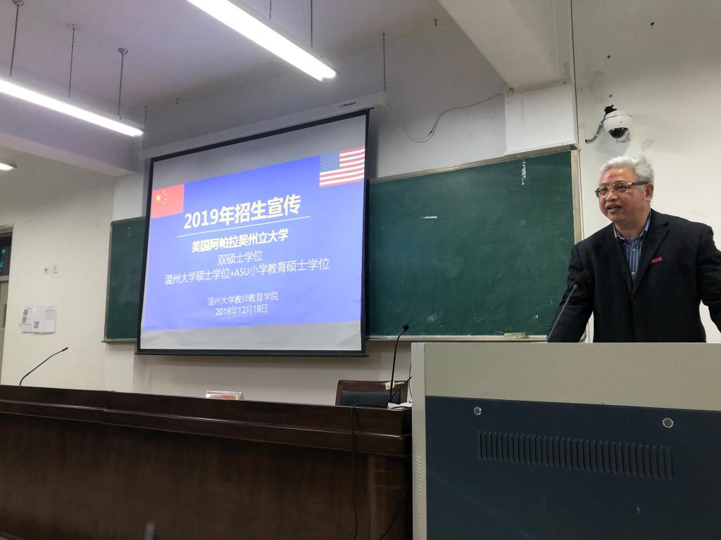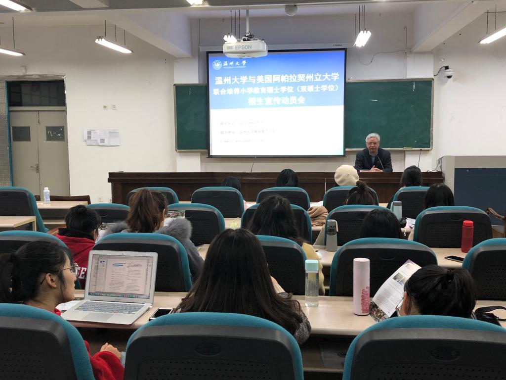 12月19日晚,美国阿帕拉契州立大学双硕士学位招生宣传动员会在温州大学南校区9c205召开,全校研究生参加会议。学院副院长潘玉进主持会议并介绍了此项硕士留学生项目的具体情况,包括学校澳门六合彩预测概况 、教育硕士学位获得要求和奖学金政策等。