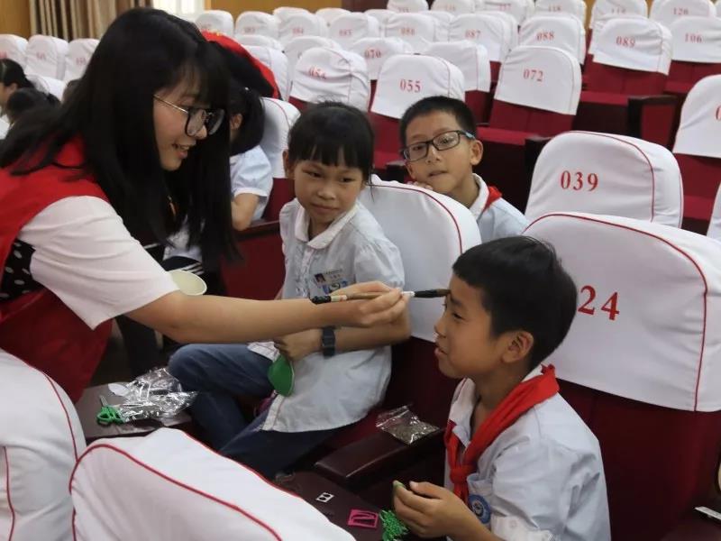 一首文秀的《端午》,加上各类节日小知识,从文墨到生活,同学们都踊跃地参与互动发言,颇有抢答的意味。而手工则是孩子们最喜爱的环节,新青年们带来了端午节的传统手工艺品——香囊,孩子们边听边动手操作,新青年们则在孩子们中忙得不亦乐乎,为孩子穿针引线,弯着腰,指导孩子们完成手中的香囊。最后给孩子们点雄黄时,仿佛彻底点燃了孩子们的热情,孩子们一遍一遍地要求在他们的头上用雄黄写上 “王”字,现场的热烈反响不断感染着在场的每个人。