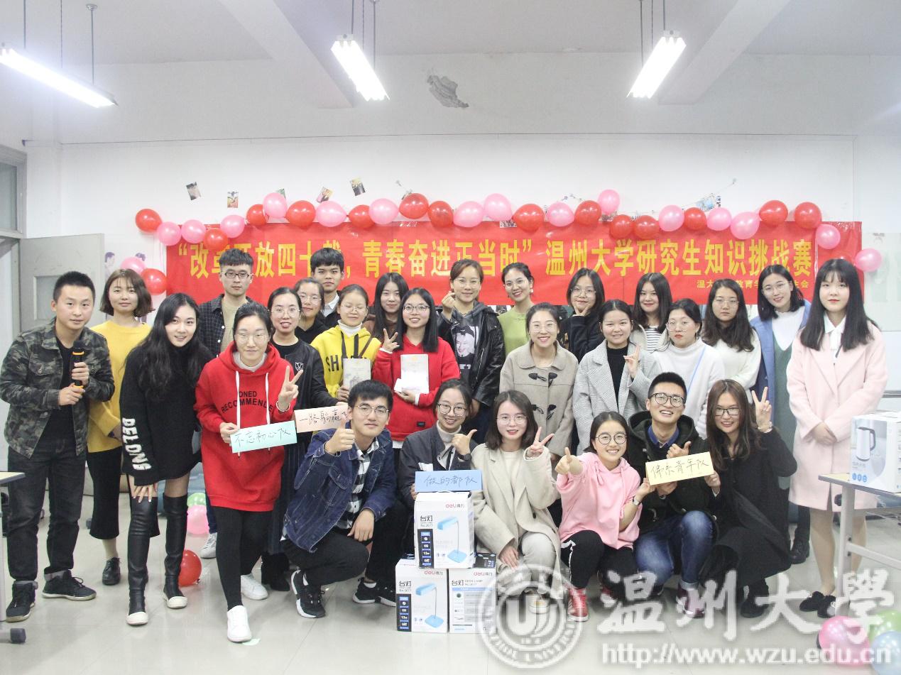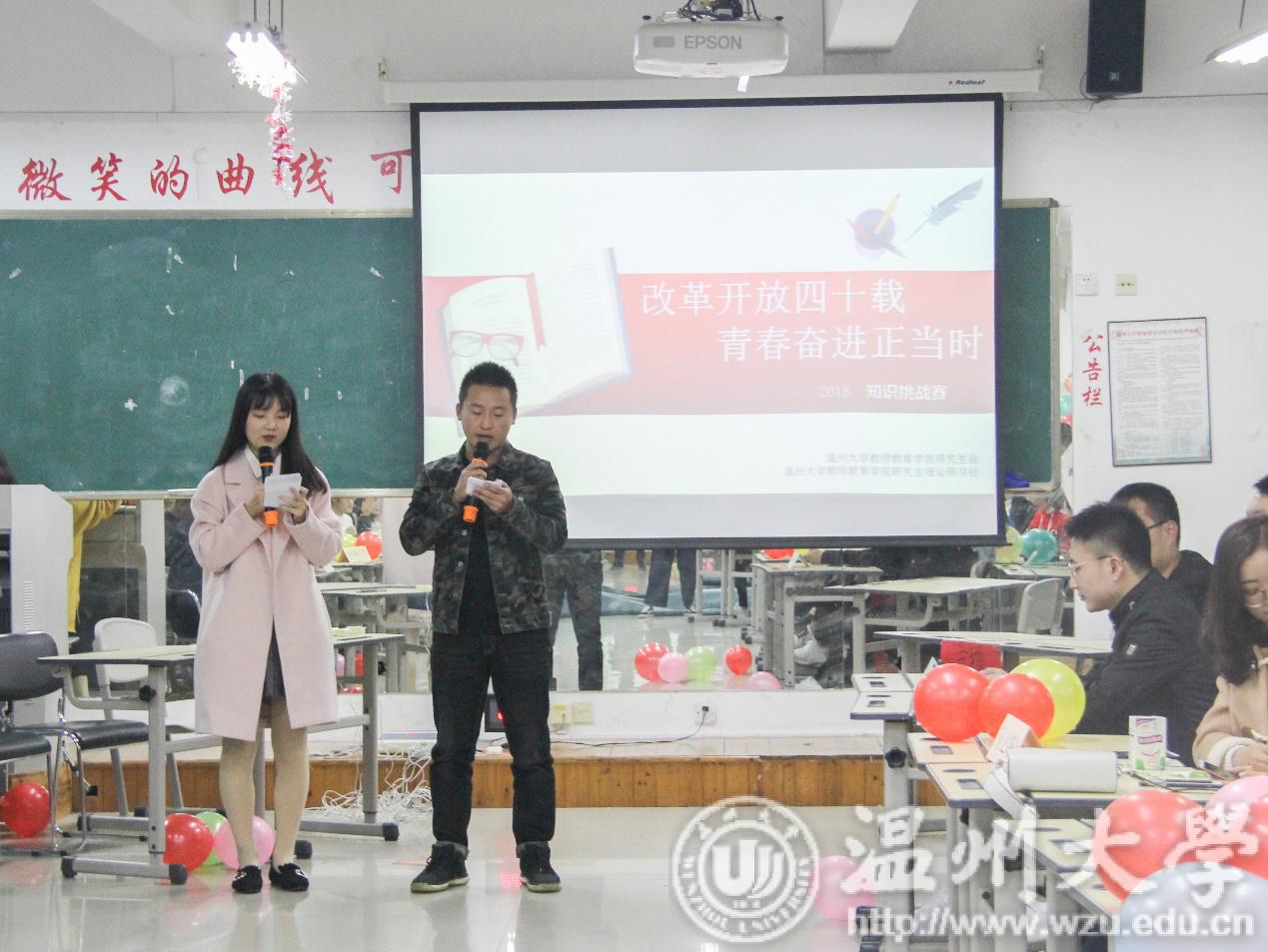 壮阔东方史,奋进新时代,为纪念改革开放40周年,引导同学们学习改革开放进程和建校历史,发扬温大学子求学问是的精神、鼓舞敢为人先的斗志,11月23日晚6:00,由教师澳门六合彩预测 研究生会主办的“改革开放四十载,青春奋进正当时”纪念改革开放四十周年知识挑战赛在南校区9B308拉开帷幕。伴随着选手的热情和欢快的音乐,主持人陈雨婷、田道文宣布比赛正式开始。