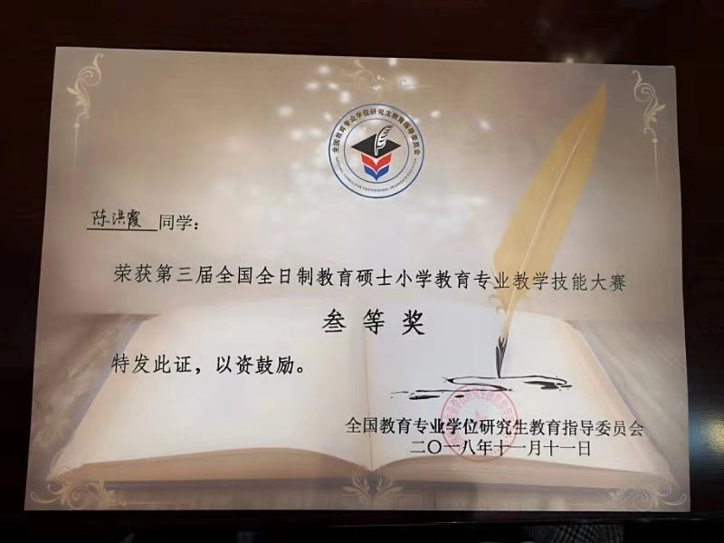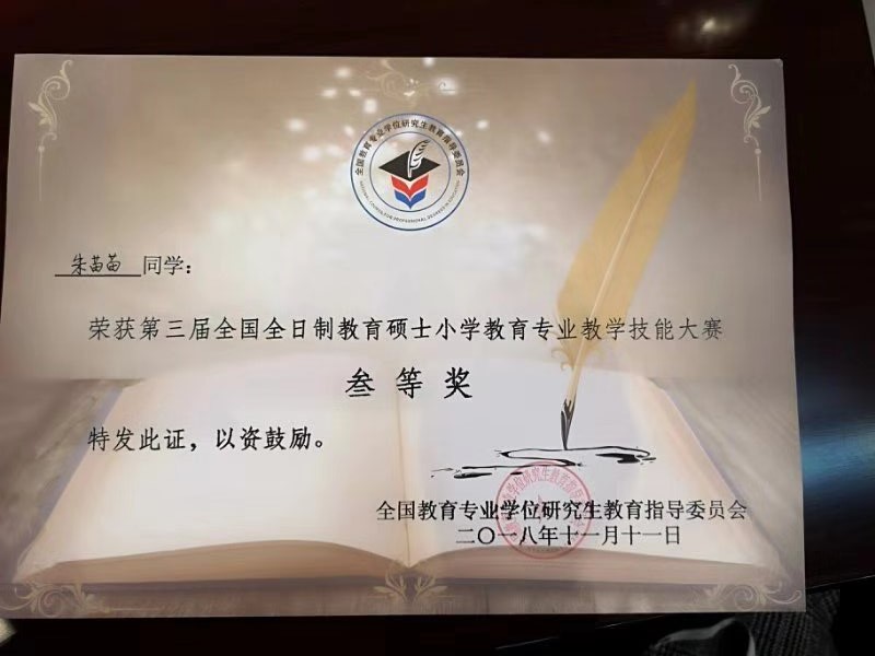 本次决赛共设小学语文组、小学数学组、小学英语组和小学科学组4个学科组。决赛内容由“模拟讲课”和“答辩”两部分组成,采用现场打分制。最终在这94名参赛选手中,评出一等奖11名,二等奖19名,三等奖30名。澳门六合彩预测网站的朱苗苗、陈洪霞两位同学均荣获三等奖。