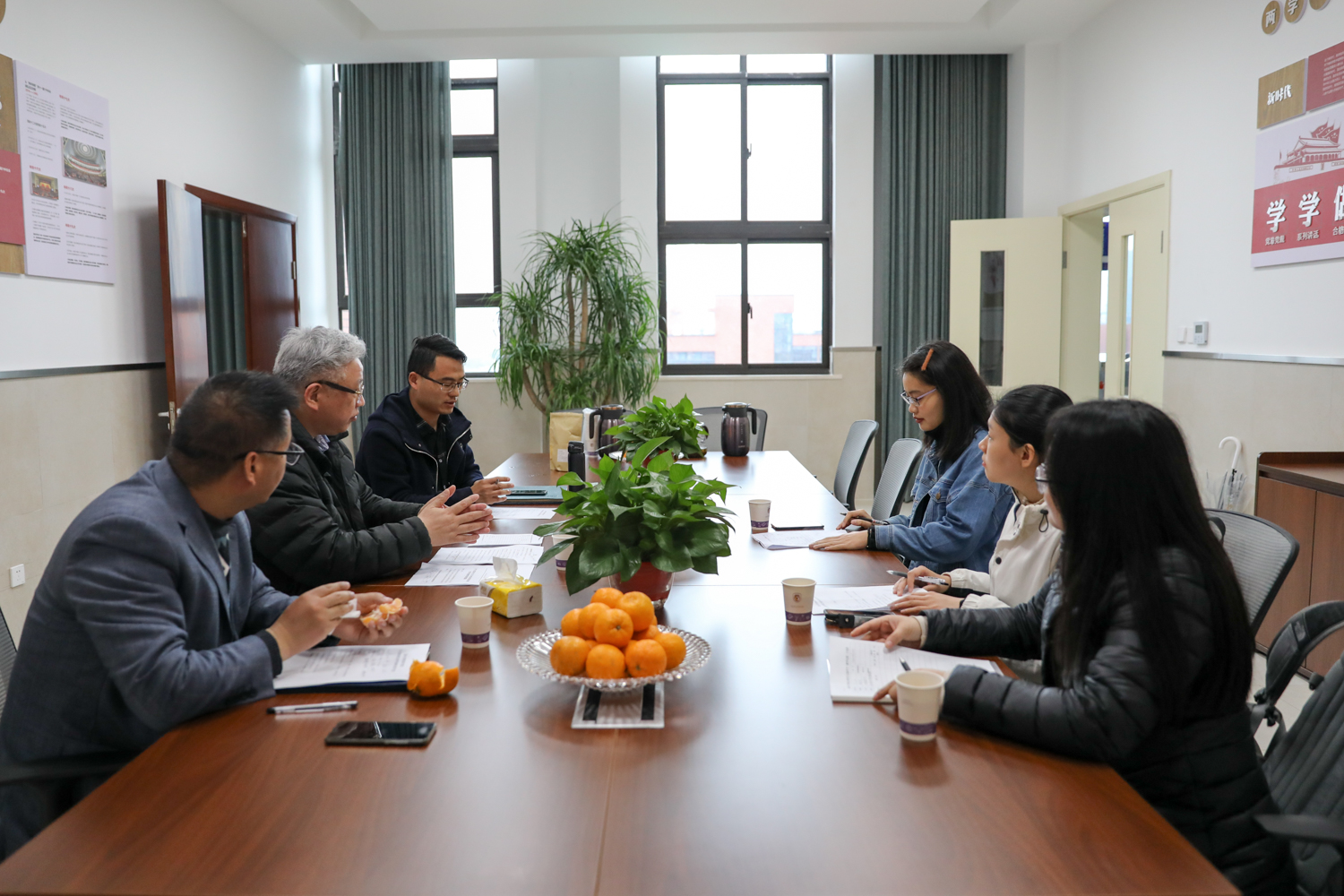 在聘任仪式上,北京外国语大学温州附属学校黄海校长首先致辞。他具体介绍了学校的办学历史、办学特色、师资队伍、社会评价等情况,并表示会尽最大努力和温州大学合作建设教育硕士专业学位研究生联合培养基地。随后,潘玉进副院长宣读此次校外导师聘任名单并颁发聘书,对北京外国语大学温州附属学校給澳门六合彩预测网站研究生提供实践教学平台表示衷心感谢;同时向与会人员介绍了温州大学教育硕士专业学位研究生实践教学各环节的具体内容和学时要求。最后,心理健康教育、小学教育、现代教育技术等三个专业研究生和各自校内外导师分组讨论实践教学计划。